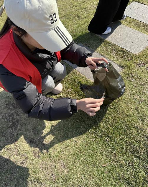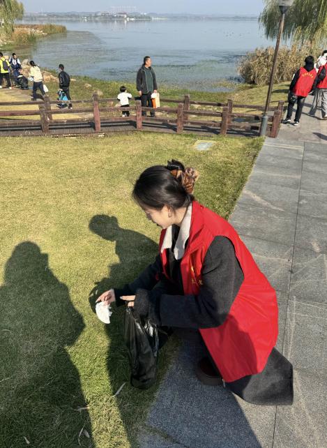 随后的“河小青”志愿服务中,同学们手持清洁工具,沿松雅湖岸线开展垃圾清理行动。大家分工协作、默契配合,重点清理沿岸绿化带、水域边缘的塑料垃圾、果皮纸屑等污染物,同时向过往市民宣传生态环保理念,引导群众自觉参与湖泊生态保护。志愿服务过程中,同学们不怕脏、不怕累,以饱满的热情投入劳动,用实际行动守护松雅湖的绿水青山。
